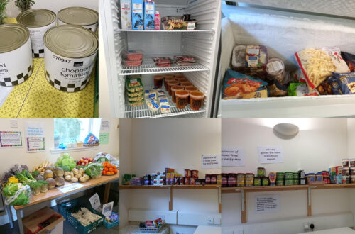 Our shelf continues to be well stocked with pasta, onion gravy, peanut butter, Doritos, guacamole, pickled onions, cans of juice and cereal.